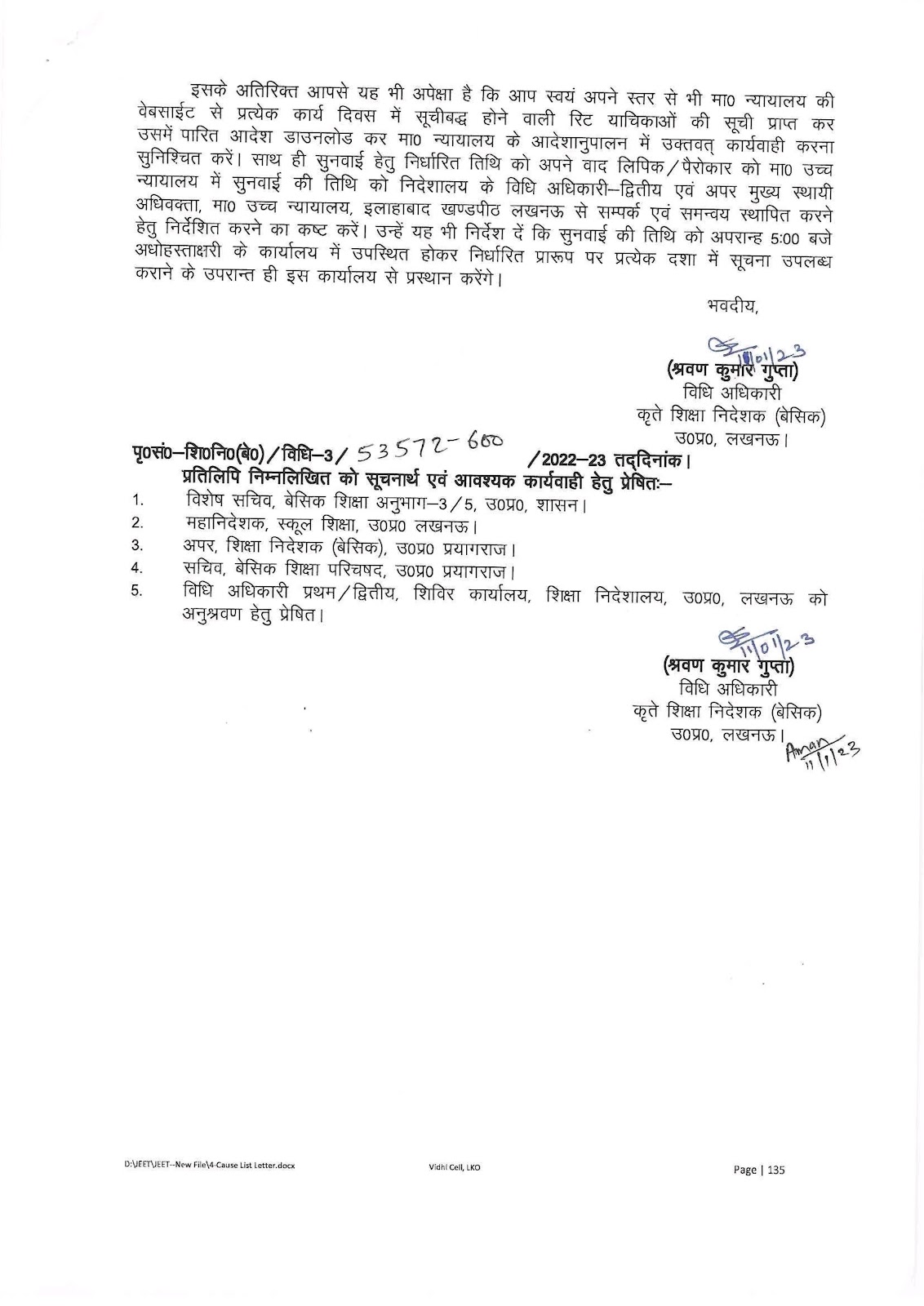 मा0 उच्च न्यायालय, इलाहाबाद खण्डपीठ लखनऊ में सुनवाई हेतु दिनांक 12.01.2023 को सूचीबद्ध विशेष अपीलों/रिट याचिकाओं में प्रभावी पैरवी/अनुश्रवण किये जाने के सम्बन्ध में।