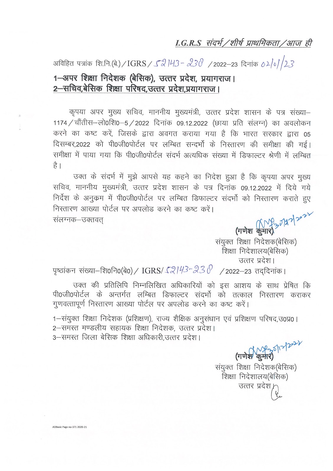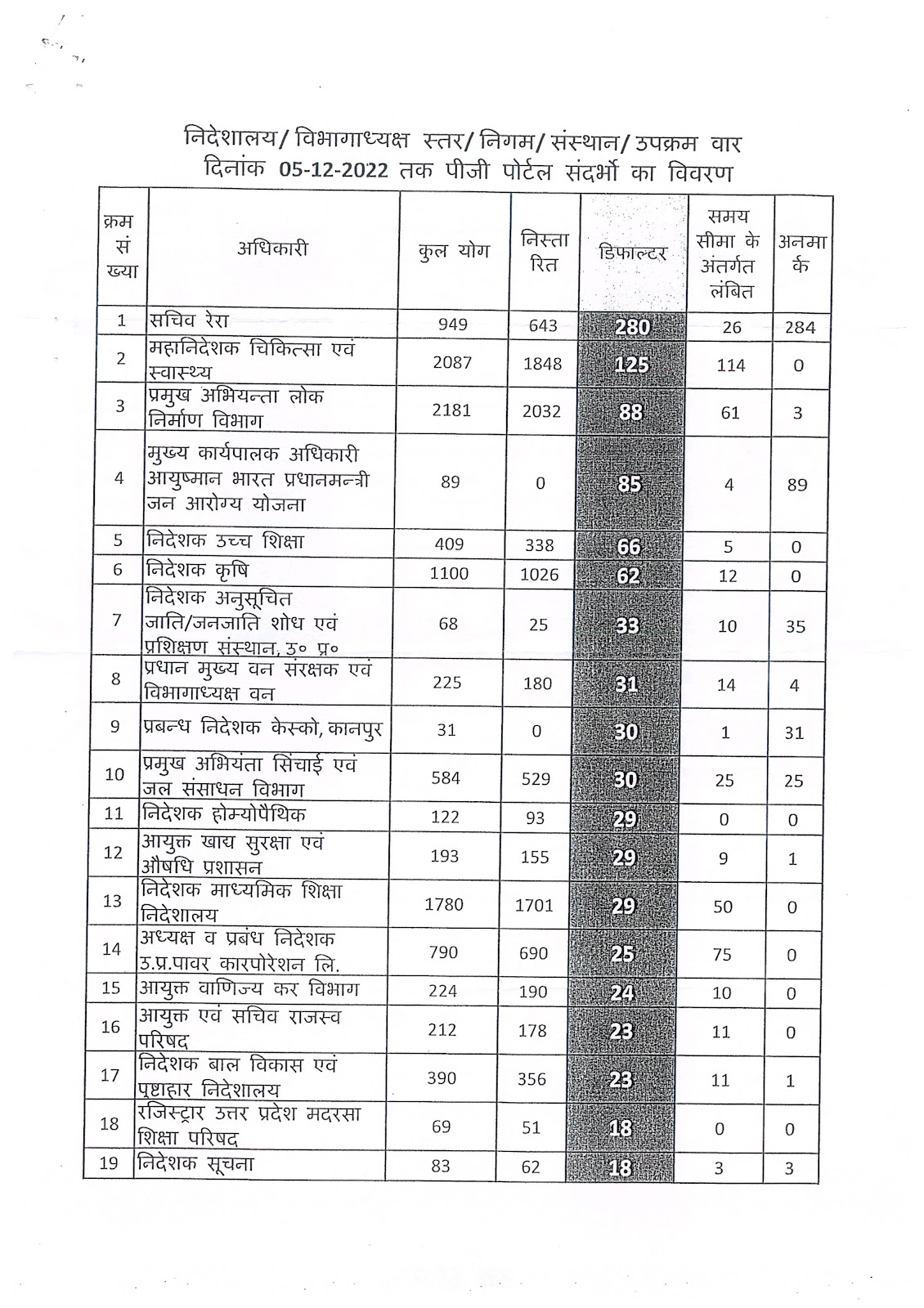 भारत सरकार द्वारा 05 दिसम्बर, 2022 को पी0जी0पोर्टल संदर्भ में डिफाल्टर श्रेणी में लम्बित प्रकरणों के सम्बन्ध में।