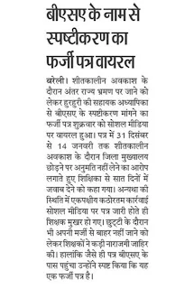 बरेली। शीतकालीन अवकाश के दौरान अंतर राज्य भ्रमण पर जाने को लेकर हुरहुरी की सहायक अध्यापिका से बीएसए के स्पष्टीकरण मांगने का फर्जी पत्र शुक्रवार को सोशल मीडिया पर वायरल हुआ। पत्र में 31 दिसंबर से 14 जनवरी तक शीतकालीन अवकाश के दौरान जिला मुख्यालय छोड़ने पर अनुमति नहीं लेने का आरोप लगाते हुए शिक्षिका से सात दिनों में जवाब देने को कहा गया। अन्यथा की स्थिति में एकपक्षीय कठोरतम कार्रवाई सोशल मीडिया पर पत्र जारी होते ही शिक्षक मुखर हो गए। छुट्टी के दौरान भी अपनी मर्जी से बाहर नहीं जाने को लेकर शिक्षकों ने कड़ी नाराजगी जाहिर की। हालांकि जैसे ही पत्र बीएसए के पास पहुंचा उन्होंने स्पष्ट किया कि यह एक फर्जी पत्र है।